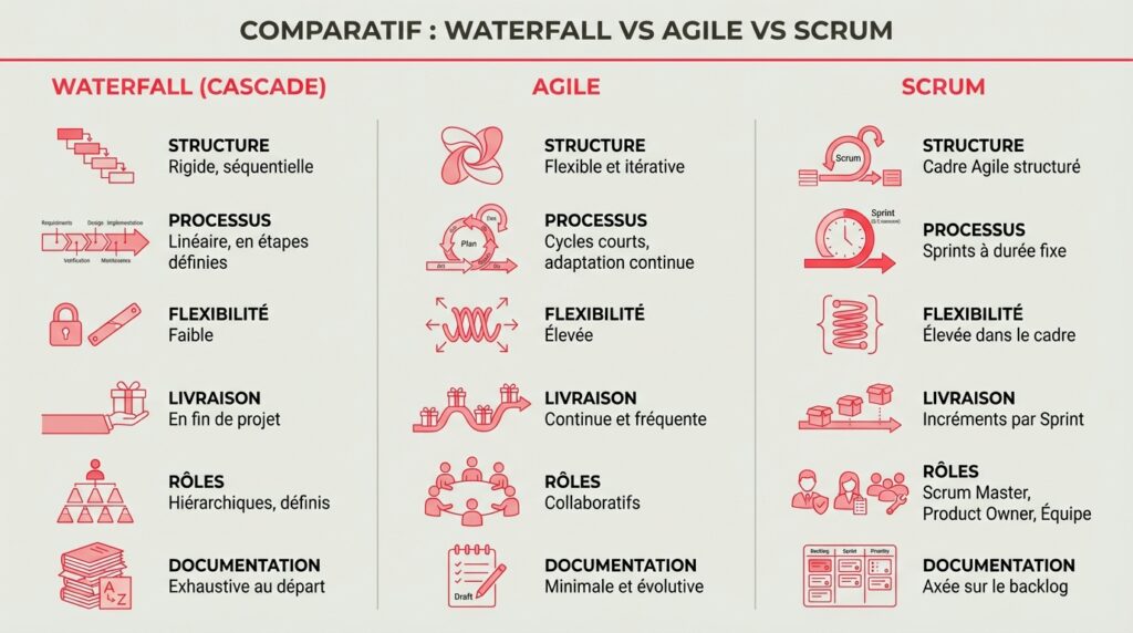 | Hybride | Projets complexes multi-contraintes | Cadrage Waterfall + exécution Agile | Modérée | Transformation digitale, lancement de marque |